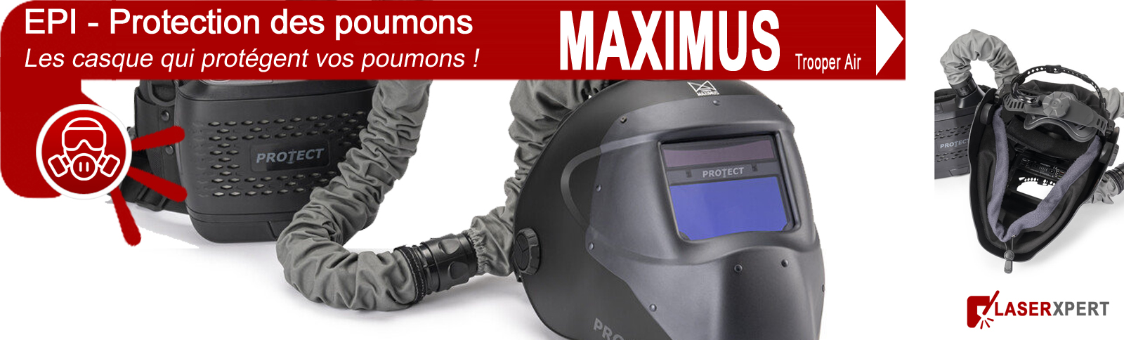 MAXIMUS Trooper Air - Le casque de sécurité laser pour les lasers à main et toutes les applications de nettoyage, avec protection laser permanente et filtre à assombrissement automatique commutable (ADF). Le casque convient aux travaux de nettoyage avec nos gammes de Laser LX & LXp.